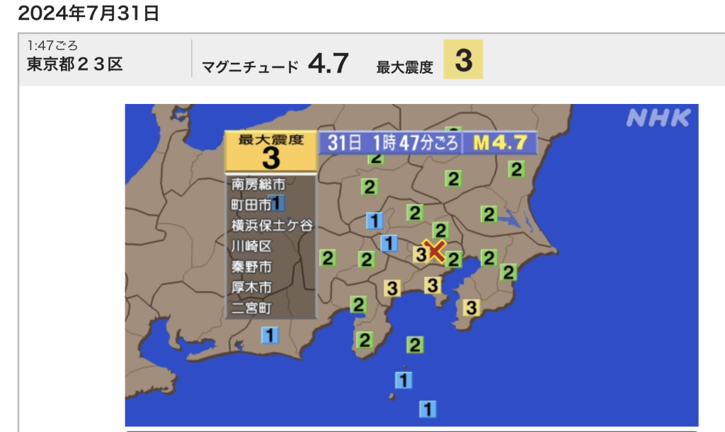 今日(31/7 日)凌晨零點 47 分,日本東京都發生 4.7 級地震,震源深度 120 公里。根據日本氣象廳的消息,這次地震最大震度為 3 級,暫時未引發海嘯警報。 地震主要影響區域包括千葉縣南房總市、東京都町田市、神奈川縣二宮町、秦野市、厚木市等地。當地居民雖然感受到明顯震動,但目前並無重大災情報告。 日本當地媒體也報導了這次地震的相關情況,指出東京都區域在深夜的地震使居民措手不及,但幸好震度並不算高,對建築物和基礎設施未造成明顯損害。 地震發生後,日本氣象廳已經密切監控震後餘震情況,並呼籲當地居民保持警惕,隨時注意官方發布的最新消息。 這次地震提醒了日本在地震多發地區的重要性,居民應該時刻準備應對突如其來的地震,確保自身安全。 |
